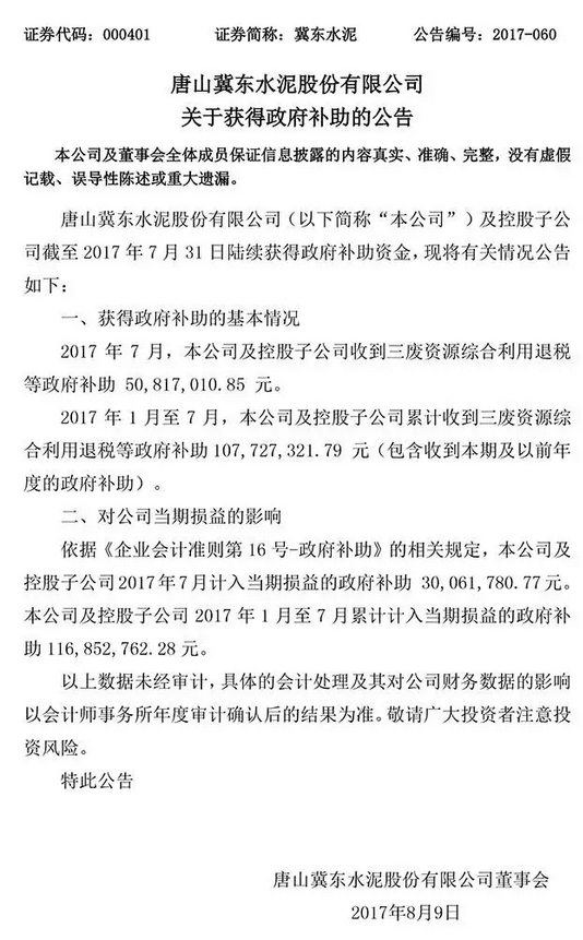 冀東水泥(000401)8月9日晚間公告,7月份公司及控股子公司收到三廢資源綜合利用退稅等政府補(bǔ)助約5082萬元,今年1月至7月,公司及控股子公司累計(jì)收到三廢資源綜合利用退稅等政府補(bǔ)助約1.08億元(包含收到本期及以前年度的政府補(bǔ)助)。公司及控股子公司2017年7月計(jì)入當(dāng)期損益的政府補(bǔ)助約3006萬元,前7個(gè)月累計(jì)計(jì)入當(dāng)期損益的政府補(bǔ)助約1.17億元。