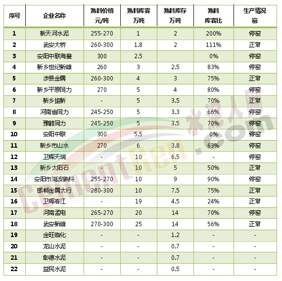 從生產(chǎn)情況來看有11家企業(yè)處于停窯停產(chǎn)情況,分別為:新天河水泥、安陽中聯(lián)海皇、新鄉(xiāng)世紀(jì)新峰、新鄉(xiāng)平原同力、河南省同力、豫鶴同力、安陽中聯(lián)、新鄉(xiāng)市山水、衛(wèi)輝天瑞、安陽市湖波熟料、河南孟電。正常生產(chǎn)的共7家企業(yè)分別為:武安大橋、涉縣金隅、新鄉(xiāng)振新、新鄉(xiāng)太陽石、邯鄲金隅太行、衛(wèi)輝春江、武安新峰水泥。