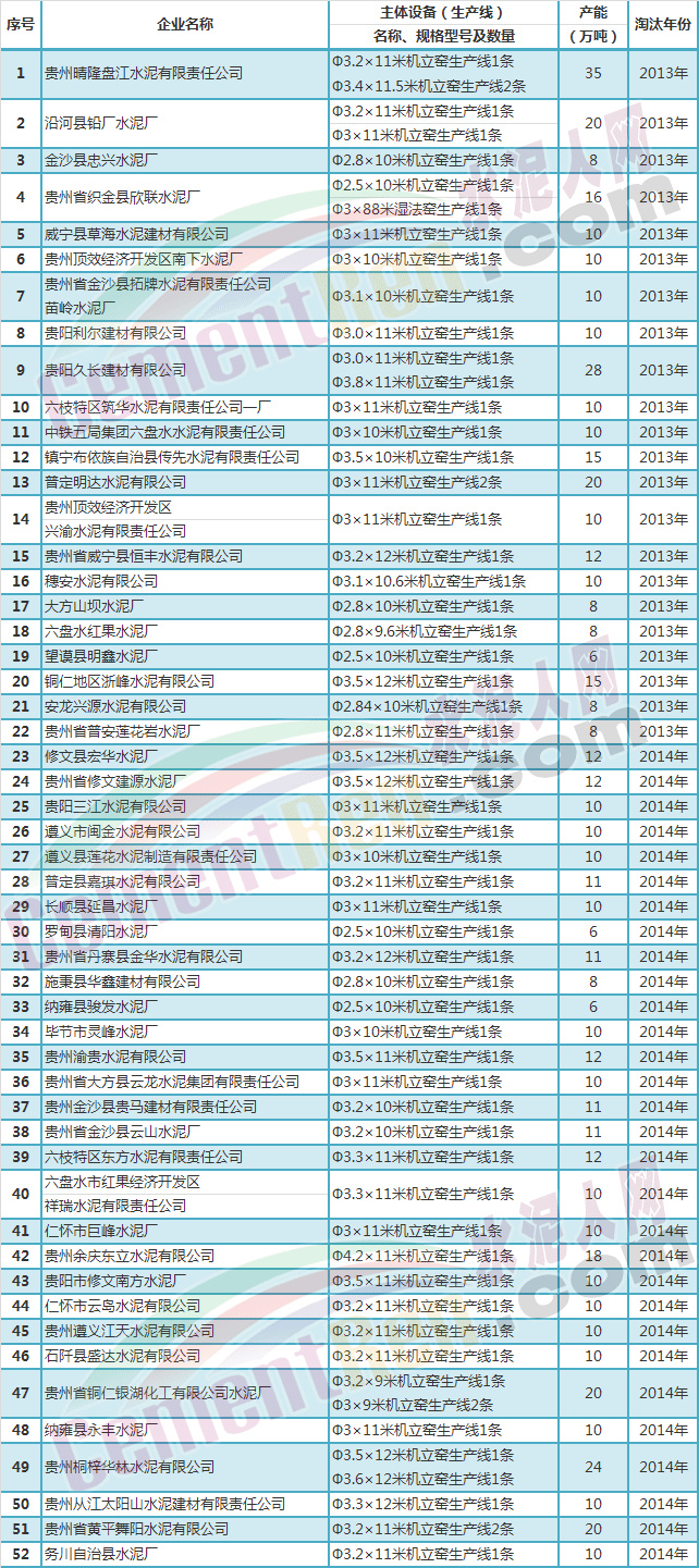 貴州省本次予以收回的部分停建水泥項目產(chǎn)能置換指標(biāo)涉及2013年到2014年間淘汰的52家企業(yè)立窯生產(chǎn)線62條,涉及產(chǎn)能631萬噸。
