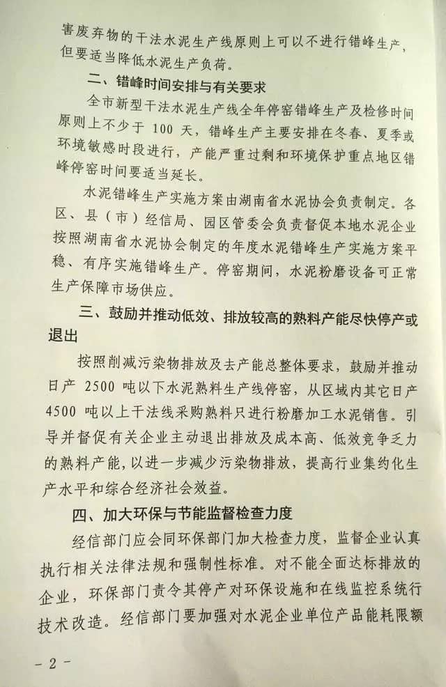 1、根據(jù)湖南全省水泥行業(yè)的過剩程度、污染物防治排放要求與各企業(yè)熟料產(chǎn)能能耗、效率等實際情況,全省新型干法熟料生產(chǎn)線全年按70%的運轉(zhuǎn)時間計算,折合每條生產(chǎn)線停窯時間為110天,其中一季度40天(除衡陽、永州停窯35天外),二季度25天,三季度25天,四季度20天。