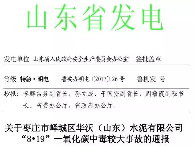 2017 年 8 月 19 日 9 時許,棗莊市嶧城區(qū)華沃(山東)水泥有限公司發(fā)生一起一氧化碳中毒較大事故,共造成 5 人死亡。