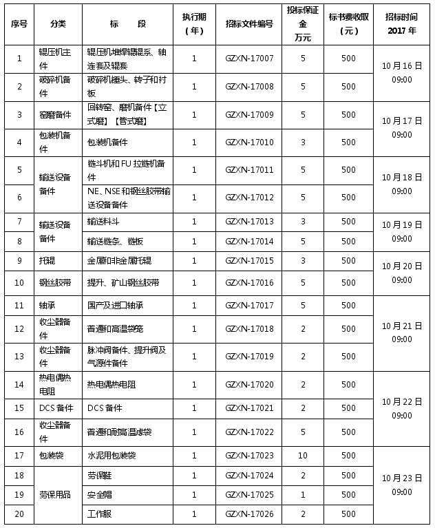 貴州西南水泥有限公司是西南水泥有限公司下屬子公司,于2012年3月21日成立。貴州西南水?dāng)M定于2017年10月中旬對(duì)下屬26家成員企業(yè)2018年度輔材備件進(jìn)行集中招標(biāo),通過邀請(qǐng)招標(biāo)選擇資質(zhì)合格、保供能力強(qiáng)、質(zhì)量及技術(shù)服務(wù)均受控的供貨單位?,F(xiàn)將相關(guān)招標(biāo)采購信息發(fā)布如下: