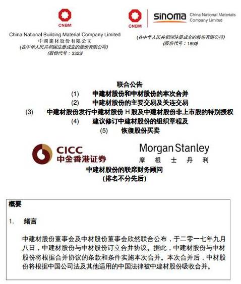 而在公告前一天7日上午,中國建材、中材股份在香港停牌,等待根據(jù)香港收購及合并守則刊發(fā)內(nèi)幕消息。隨后,中建材集團旗下多家上市公司像約好了似的,齊齊停牌,中國巨石、中材國際、寧夏建材、祁連山上交所停牌,北新建材、天山股份、中材科技深交所停牌,原因還都是擬披露重大事項,引發(fā)外界無數(shù)猜想,“中國神材”的合并重組時代來臨!