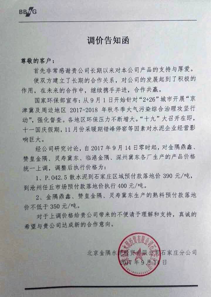 北京金隅水泥經(jīng)貿(mào)有限公司石家莊分公司調(diào)價告知函原文如下: