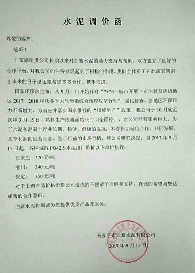 石家莊曲寨水泥的調(diào)價通知稱:國家環(huán)保部宣布從9月1日開始針對“2+26”城市開展“京津冀及周邊地區(qū)2017-2018年秋冬季大氣污染綜合治理攻堅行動”,強化督查。各地區(qū)環(huán)保壓力不斷增大。