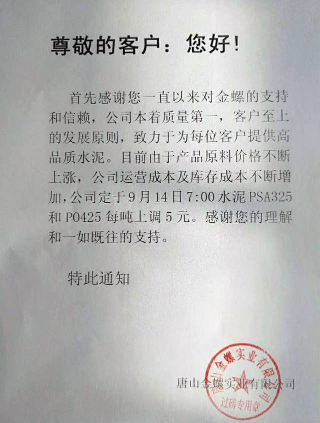 另有唐山地區(qū)兩家水泥企業(yè)同期發(fā)布了調(diào)價通知: