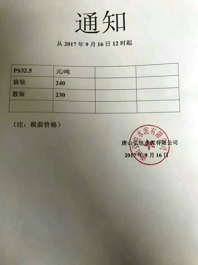 經(jīng)研究討論,自2017年9月14日零時起,對金隅鼎鑫、贊皇金隅、靈壽冀東、臨港金隅、深州冀東各廠生產(chǎn)的產(chǎn)品價格統(tǒng)一上調(diào),調(diào)整后執(zhí)行價格為: