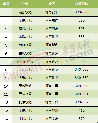 9月14日河南省部分地區(qū)水泥價(jià)格