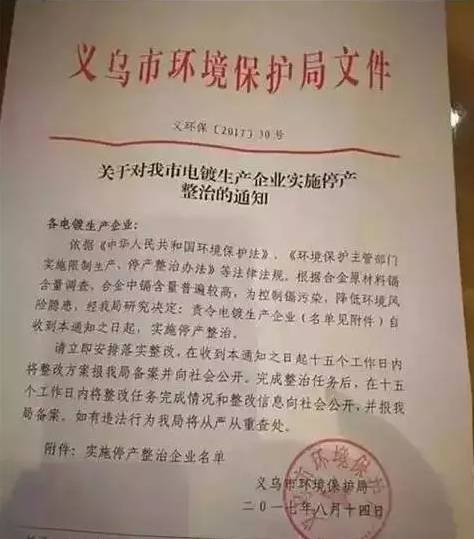 浙江省又開始了新一輪嚴(yán)酷的環(huán)境保護(hù)治理與整頓,于2017年8月14日下發(fā)正式文件,“依據(jù)《中華人民共和國(guó)環(huán)境保護(hù)法》、《環(huán)境保護(hù)主管部門實(shí)施限制生產(chǎn)、停產(chǎn)整治辦法》等法律法規(guī),為降低環(huán)境風(fēng)險(xiǎn)隱患,責(zé)令電鍍生產(chǎn)企業(yè)實(shí)施停產(chǎn)整治,在十五個(gè)工作日內(nèi)將整改任務(wù)完成情況和整改信息向社會(huì)公開。”