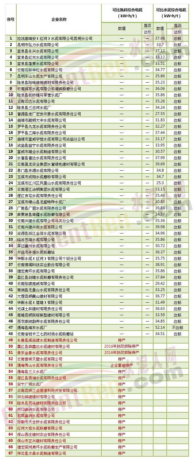 【水泥人網(wǎng)】云南省水泥企業(yè)2016年產(chǎn)品可比綜合電耗情況