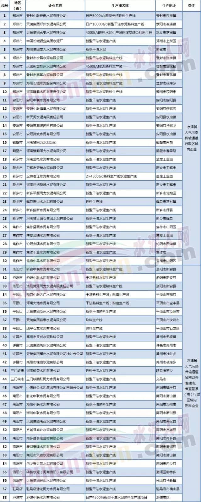(1)鄭州、開封、安陽市、鶴壁、新鄉(xiāng)、焦作、濮陽、鞏義、蘭考、滑縣、長垣等京津冀大氣污染傳輸通道行政區(qū)域內(nèi)的43家水泥2017年11月15日至2018年3月15日,全部停產(chǎn)。
