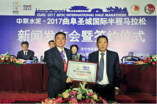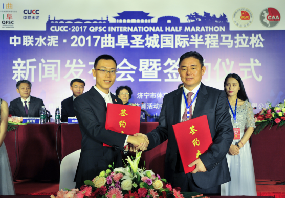 隨后,北京初美體育文化發(fā)展有限公司總經(jīng)理吳宇熙與中國聯(lián)合水泥集團有限公司總經(jīng)理、黨委副書記孫建成簽約。中國聯(lián)合水泥集團有限公司正式成為2017曲阜圣城國際半程馬拉松的獨家冠名商。濟寧市體育局副局長邵波為冠名贊助商中國聯(lián)合水泥集團有限公司授牌。賽事獨家冠名商中國聯(lián)合水泥集團有限公司總經(jīng)理、黨委副書記孫建成致辭。