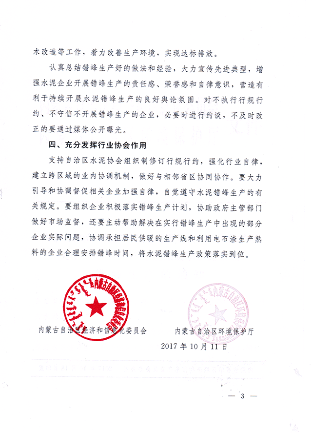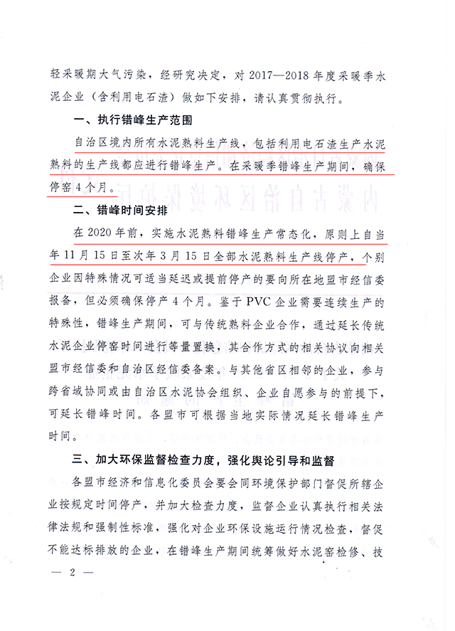 執(zhí)行錯(cuò)峰生產(chǎn)的范圍包括自治區(qū)境內(nèi)所有水泥熟料生產(chǎn)線,包括利用電石渣生產(chǎn)水泥的熟料線,在采暖季確保停窯四個(gè)月。時(shí)間安排為2017年11月15日至2018年3月15日全部水泥熟料生產(chǎn)線停產(chǎn)。有特殊情況的企業(yè)可延遲或提前停產(chǎn),但必須確保停夠四個(gè)月。原文如下: