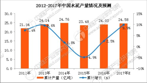 據(jù)中商產(chǎn)業(yè)研究院發(fā)布的《2017-2022年中國(guó)水泥行業(yè)市場(chǎng)前景及投資機(jī)會(huì)研究報(bào)告》數(shù)據(jù)統(tǒng)計(jì)顯示,2016年中國(guó)水泥累計(jì)產(chǎn)量為24.03億噸,累計(jì)增長(zhǎng)2.5%;預(yù)計(jì)2017年中國(guó)水泥累計(jì)產(chǎn)量將達(dá)24.58億噸,累計(jì)增長(zhǎng)約9.9%。據(jù)最新數(shù)據(jù)統(tǒng)計(jì)顯示,2017年9月中國(guó)水泥產(chǎn)量2.2億噸,同比下滑2%;2017年1-9月中國(guó)水泥產(chǎn)量17.6億噸,同比下滑0.5%。