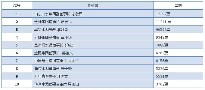 借此時(shí)機(jī),水泥行業(yè)知名媒體水泥內(nèi)參積極響應(yīng)國家號(hào)召,發(fā)起“誰是水泥行業(yè)最具影響力的企業(yè)家”投票,得票前十名企業(yè)家如下: