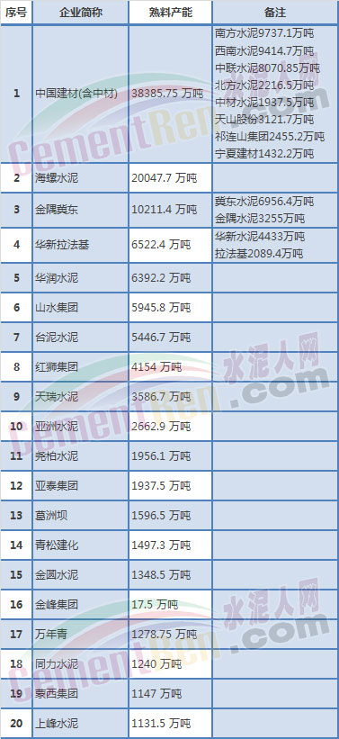 中國水泥熟料產(chǎn)能前二十強(qiáng)