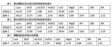 某廠生料配比采用鈣鐵控制,控制指標(biāo)是CaO:38.83%、Fe2O3:2.74%,生料目標(biāo)值為KH:0.97;SM:1.85;IM:1.20。原料配比不變,“表1”是變化前的石灰石成分和對(duì)應(yīng)的生料成分,“表2”是變化后的石灰石成分和對(duì)應(yīng)的生料成分,可見由于石灰石成分變化,生料成分和率值發(fā)生很大變化。根據(jù)氧化鈣和三氧化二鐵的控制指標(biāo)進(jìn)行原料配比調(diào)整,“表3”是調(diào)整后的生料成分和率值,可見氧化鈣和三氧化二鐵符合控制指標(biāo)要求,生料三率值并不符合目標(biāo)值要求,主要原因是二氧化硅和三氧化二鋁發(fā)生了大幅度的變化。