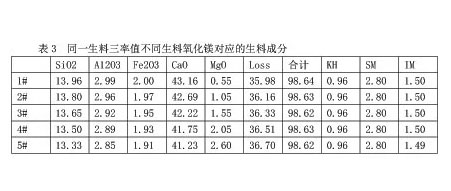 “表3”是同一生料三率值,不同生料氧化鎂對(duì)應(yīng)的生料成分和率值,5組數(shù)據(jù)的三率值相同,氧化鎂不同,三氧化二鐵無(wú)很大變化,氧化鈣變化很大,數(shù)據(jù)表明:當(dāng)生料三率值不變時(shí),不同生料氧化鎂對(duì)應(yīng)不同的生料氧化鈣,鈣鐵控制法的關(guān)鍵是保證石灰石氧化鎂穩(wěn)定,如果無(wú)法保證石灰石氧化鎂穩(wěn)定,必須同時(shí)測(cè)定出磨生料的氧化鎂,及時(shí)調(diào)整出磨生料氧化鈣的控制指標(biāo)。