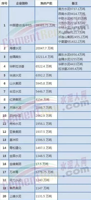中國(guó)水泥熟料產(chǎn)能前二十強(qiáng)