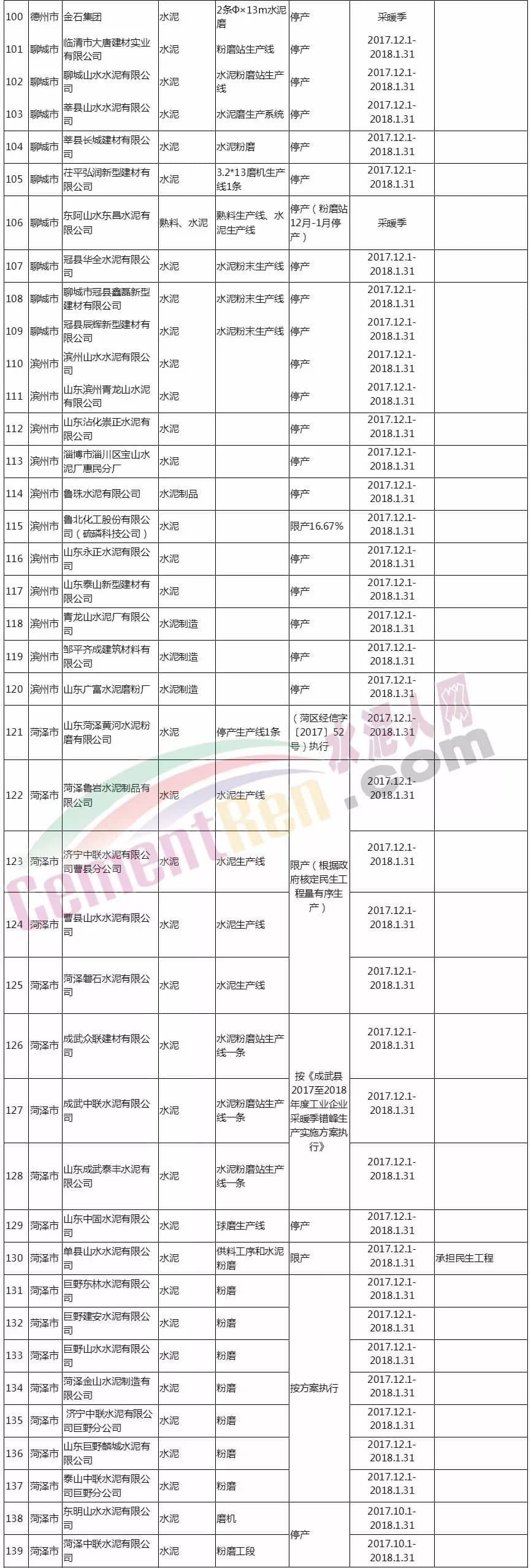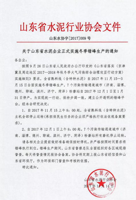 同日,山東省水泥協(xié)會發(fā)布《關(guān)于山東省水泥企業(yè)正式實施冬季錯峰生產(chǎn)的通知》,該通知明確規(guī)定: