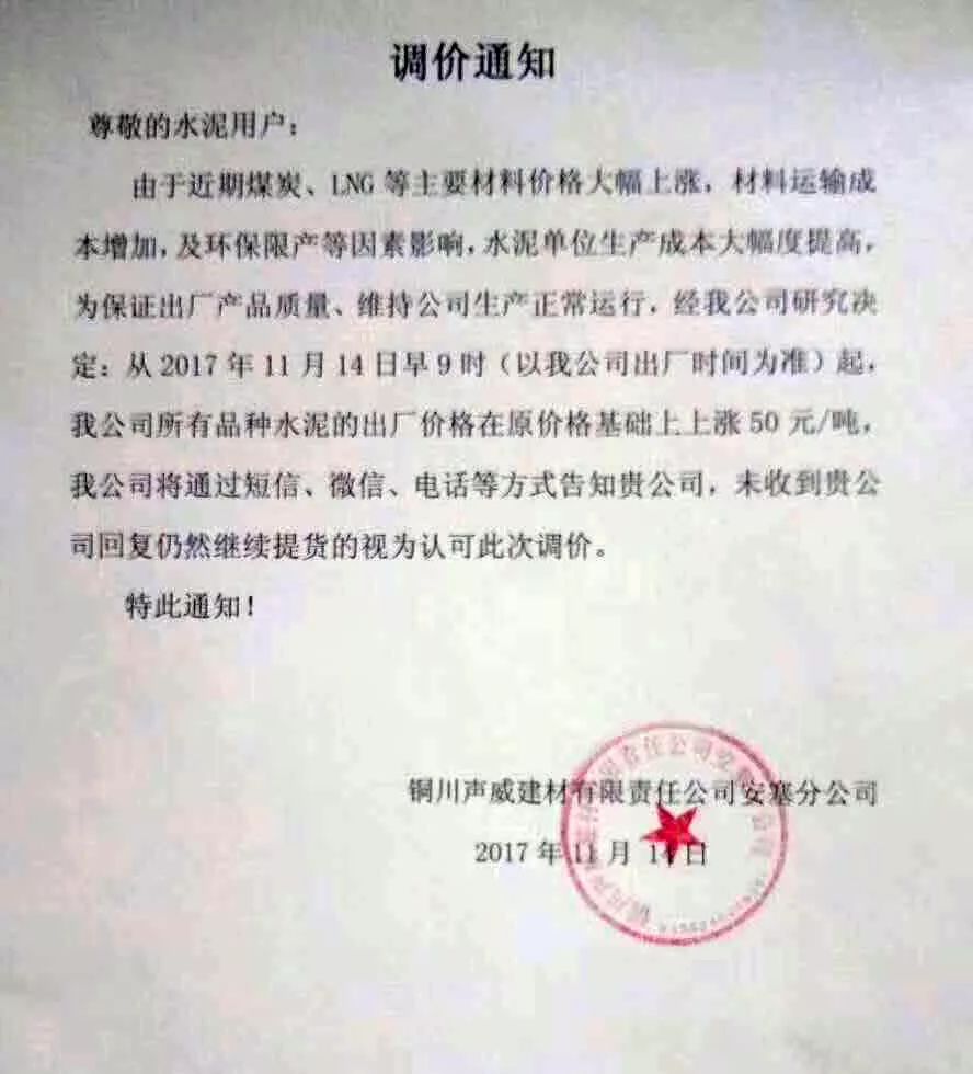銅川聲威建材有限責(zé)任公司安塞分公司調(diào)價(jià)通知稱:由于近期煤炭、LNG等主要材料價(jià)格大幅上漲,材料運(yùn)輸成本增加,環(huán)保限產(chǎn)等因素影響,水泥單位生產(chǎn)成本大幅度提高,為保證出廠產(chǎn)品質(zhì)量、維持公司生產(chǎn)正常運(yùn)行,經(jīng)我公司研究決定:從2017年11月14日早9時起對公司所有品種水泥的出廠價(jià)格在原基礎(chǔ)上上漲50元/噸。