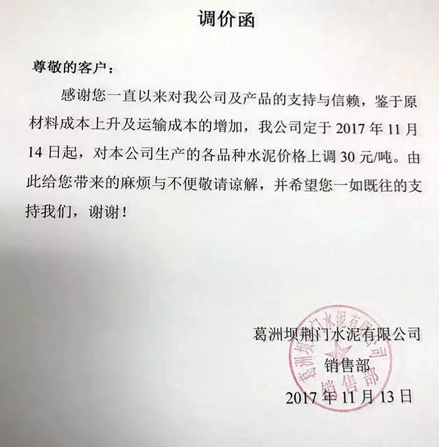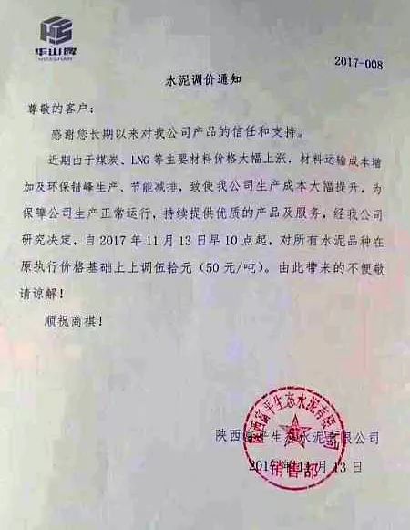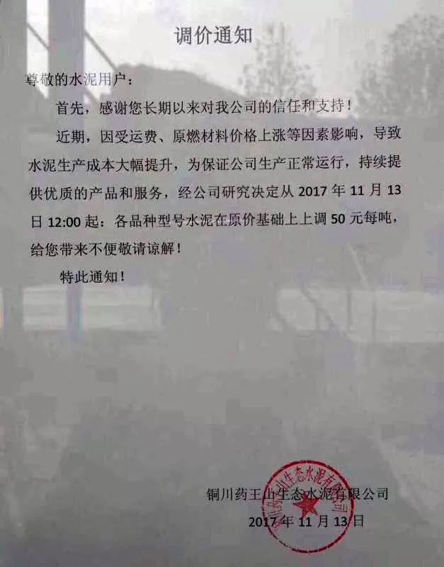 銅川藥王山生態(tài)水泥有限公司調(diào)價(jià)通知稱,因受運(yùn)費(fèi)、原材料,燃料價(jià)格上漲等因素影響,導(dǎo)致水泥生產(chǎn)成本大幅度提升,為保證公司生產(chǎn)正常運(yùn)行,持續(xù)提供優(yōu)質(zhì)的產(chǎn)品和服務(wù),經(jīng)公司研究決定從2017年11月13日12:00起,各品種型號水泥在原價(jià)基礎(chǔ)上上調(diào)50元/噸。