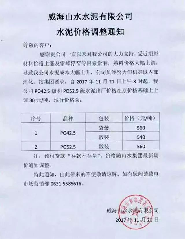 【水泥人網(wǎng)】近日,山東省的水泥熟料價(jià)格大漲,多家企業(yè)通知下游客戶價(jià)格上調(diào)。其中威海山水水泥有限公司水泥價(jià)格調(diào)整通知稱,受近期原材料價(jià)格上漲及錯(cuò)峰停窯因素影響,熟料價(jià)格大幅上調(diào),導(dǎo)致公司水泥成本大幅上升。公司雖經(jīng)努力但仍難以內(nèi)部消化。按集團(tuán)要求自2017年11月21日上午8時(shí)起,PO42.5級(jí)和PO52.5級(jí)水泥出廠價(jià)格在原價(jià)格基礎(chǔ)上上調(diào)30元/噸。現(xiàn)行價(jià)格PO42.5水泥袋裝價(jià)格560元/噸,散裝價(jià)格540元/噸。PO52.5散裝水泥560元/噸。