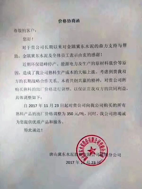 河北省主導(dǎo)企業(yè)唐山冀東水泥于昨日發(fā)布了熟料價(jià)格協(xié)商函,《價(jià)格協(xié)商函》稱因近期環(huán)保錯(cuò)峰停產(chǎn)、能源電力及生產(chǎn)的原材料漲價(jià)等原因,造成了公司熟料生產(chǎn)成本的大幅上漲。考慮到長(zhǎng)期戰(zhàn)略合作關(guān)系,本著共贏的精神,自23日起熟料出廠價(jià)格上調(diào)為350元/噸 。