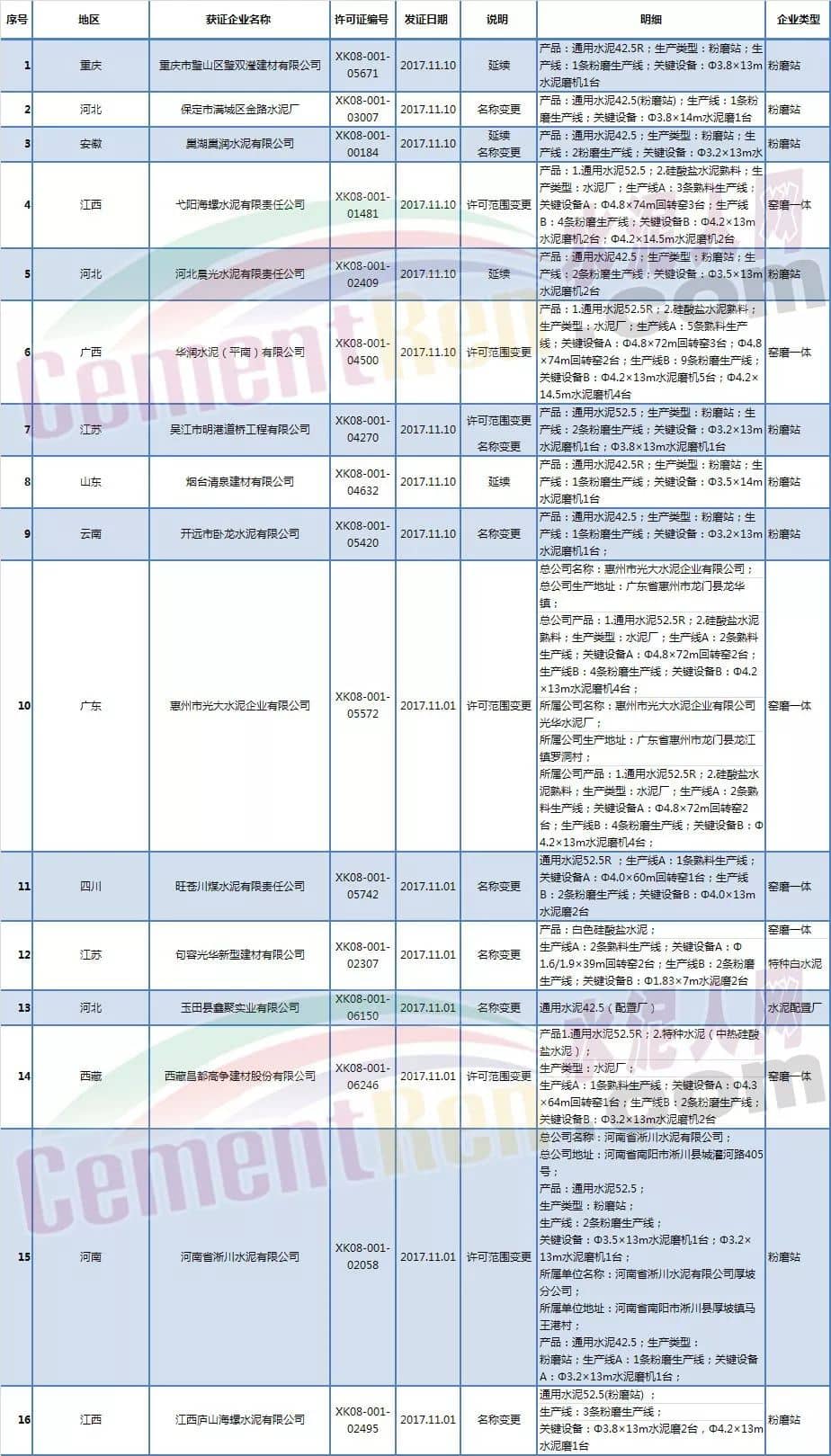 水泥人網(wǎng)28日消息,本月國家質(zhì)檢總局共簽署發(fā)放12個省自治區(qū)16家企業(yè)的生產(chǎn)許可證。其中粉磨站企業(yè)9家,窯磨一體企業(yè)共6家(含兩家特種水泥生產(chǎn)企業(yè)),水泥配置站1家。涉及變更的企業(yè)共13家,其中涉及名稱變更的共8家企業(yè),許可證范圍變更的共6家企業(yè)。到期延續(xù)的共4家企業(yè)。