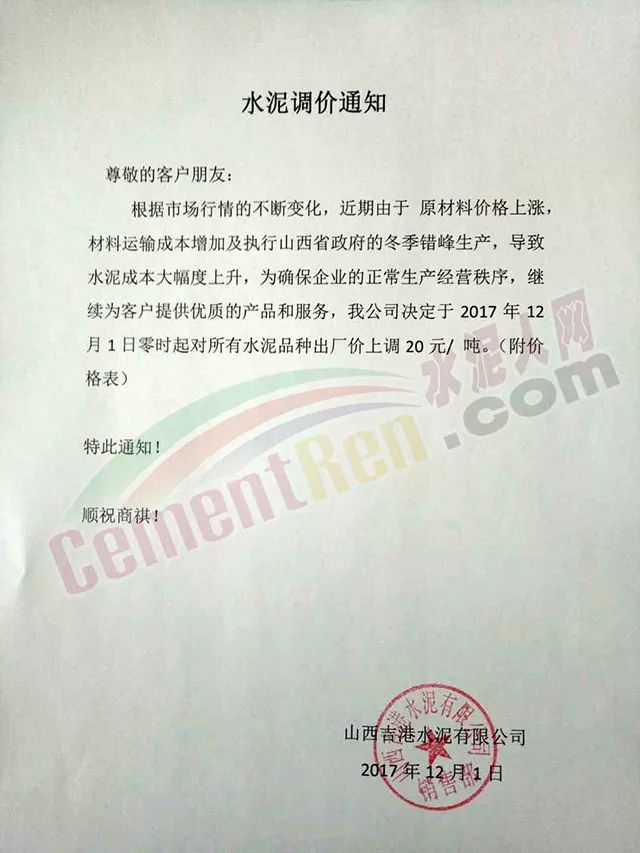 感謝您對(duì)我公司長(zhǎng)期以來(lái)的信賴(lài)與支持,根據(jù)近期市場(chǎng)變化及公司產(chǎn)銷(xiāo)形勢(shì),決定于2017年12月1日00:00起對(duì)各品種水泥價(jià)格上調(diào)20元/噸,順祝商祺!