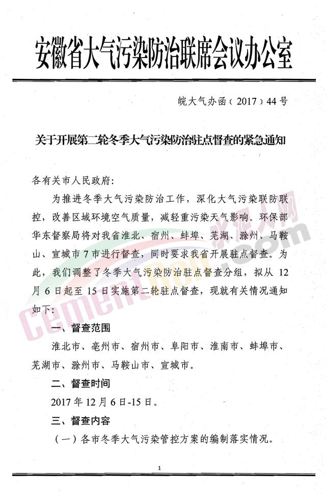 【水泥人網(wǎng)】日前,安徽省大氣污染防治聯(lián)席會議辦公室發(fā)布《關(guān)于開展第二輪冬季大氣污染防治駐點(diǎn)督查的緊急通知》通知稱:為推進(jìn)冬季大氣污染防治工作,深化大氣污染聯(lián)防聯(lián)控,改善區(qū)域環(huán)境空氣質(zhì)量,減輕重污染天氣影響。環(huán)保部華東督察局將對安徽省淮北、宿州、蚌埠、蕪湖、滁州、馬鞍山、宣城市7市進(jìn)行督查,同時(shí)要求安徽省開展駐點(diǎn)督查,為此安徽省調(diào)整了冬季大氣污染防治駐點(diǎn)督查分組,擬從12月6日起至15日實(shí)施第二輪駐點(diǎn)督查。