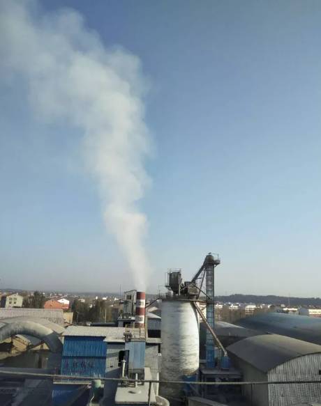 進(jìn)廠時礦渣微粉含水量大(約10%左右),需通過輸送帶送至烘烤設(shè)備進(jìn)行烘烤,達(dá)到將含水量降至1%以下才符合生產(chǎn)要求。該生產(chǎn)過程中所產(chǎn)生的氣體均需通過布袋除塵過濾后才向外界排放,成分主要是水。由于冬季氣溫低,熱的水蒸氣遇冷凝結(jié)形成水霧。夏季溫度高則無此現(xiàn)象。居民朋友們不必?fù)?dān)心。