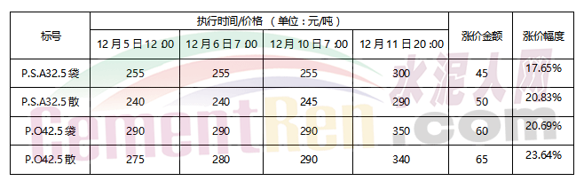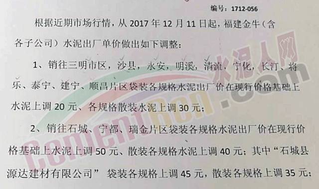 福建金牛水泥有限公司進(jìn)入12月份已陸續(xù)幾次發(fā)布提價通知,全面調(diào)整各區(qū)域出貨價格。各品種水泥上調(diào)幅度在20-40元/噸左右。