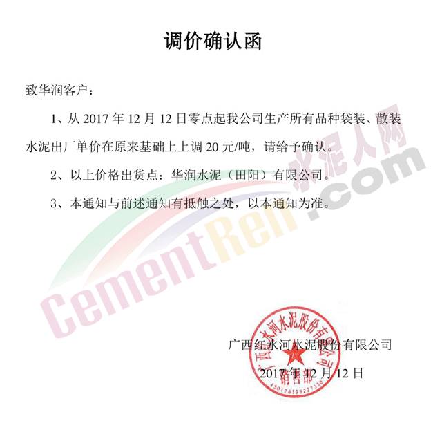 昨日(12日)廣西紅水河水泥股份有限公司發(fā)布調(diào)價確認(rèn)函稱,從零點起所有品種水泥出廠單價在原基礎(chǔ)上上調(diào)20元/噸。