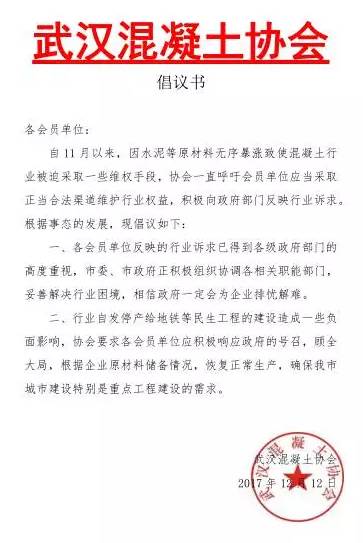 二、行業(yè)自發(fā)停產(chǎn)給地鐵等民生工程的建設(shè)造成一些負面影響,協(xié)會要求各會員單位積極響應(yīng)政府的號召,顧全大局,根據(jù)企業(yè)原材料儲備情況。恢復正常生產(chǎn),確保武漢市城市建設(shè)特別是重點工程的需求。