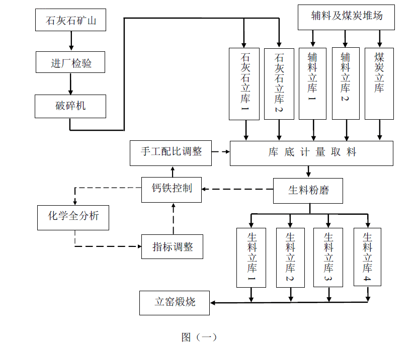 “圖一”是傳統(tǒng)的立窯黑生料質(zhì)量控制圖,入磨石灰石以及入窯生料只是依靠簡(jiǎn)單的多庫(kù)搭配,出磨生料進(jìn)行鈣鐵控制,每小時(shí)檢驗(yàn)一次,根據(jù)出磨生料的鈣鐵檢驗(yàn)數(shù)據(jù)進(jìn)行原料配比調(diào)整,出磨生料24小時(shí)綜合樣進(jìn)行化學(xué)全分析,得到生料的三率值,然后進(jìn)行鈣鐵目標(biāo)值調(diào)整,用于后期的出磨生料過(guò)程質(zhì)量控制。