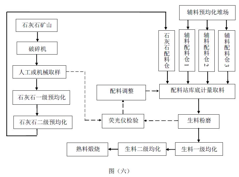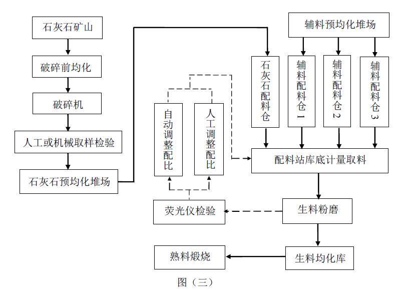 “圖二”是目前比較通用的水泥生料質(zhì)量控制圖,礦山石灰石進(jìn)廠經(jīng)破碎后,通過(guò)人工或機(jī)械取樣檢驗(yàn),進(jìn)入石灰石預(yù)均化堆場(chǎng),經(jīng)取料機(jī)取料后進(jìn)入石灰石配料倉(cāng),配料站庫(kù)底計(jì)量取料后進(jìn)行生料粉磨,出磨生料經(jīng)過(guò)連續(xù)取樣、熒光儀檢驗(yàn)后進(jìn)入生料均化庫(kù),最后進(jìn)行熟料煅燒,原料配比調(diào)整有自動(dòng)調(diào)整和人工調(diào)整兩種方式。