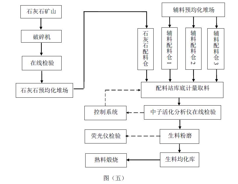 “圖五”是目前比較先進(jìn)的水泥生料質(zhì)量控制圖,在好多大企業(yè)得到應(yīng)用,進(jìn)廠石灰石經(jīng)破碎后在傳送帶上用中子活化分析儀進(jìn)行在線(xiàn)檢驗(yàn),經(jīng)均化后進(jìn)入配料站。在配料站的庫(kù)底進(jìn)行計(jì)量取料,用中子活化分析儀對(duì)傳送帶上的所有入磨混合物料進(jìn)行在線(xiàn)檢驗(yàn),一分鐘提供一次檢驗(yàn)數(shù)據(jù),同時(shí)配備的控制系統(tǒng)一分鐘自動(dòng)調(diào)整一次原料配比,出磨生料同樣需要熒光儀檢驗(yàn),防止失控。