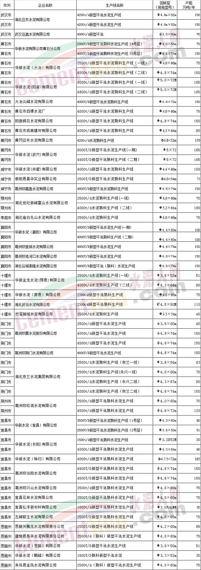 湖北省水泥(熟料)產(chǎn)能現(xiàn)狀清單