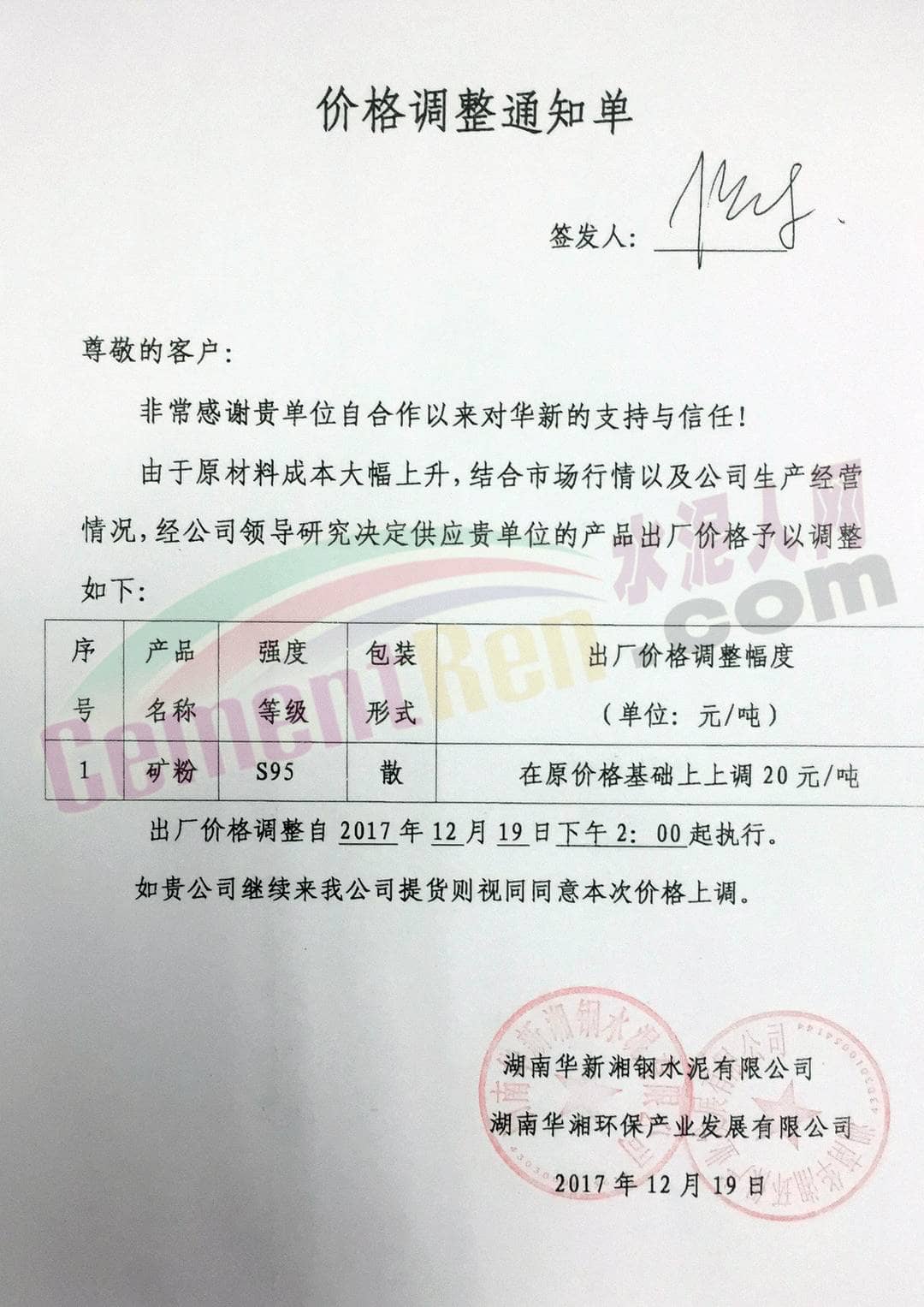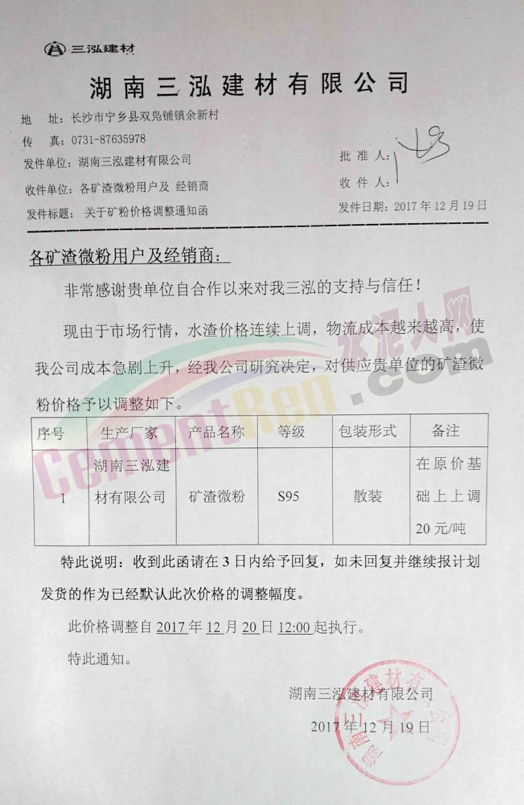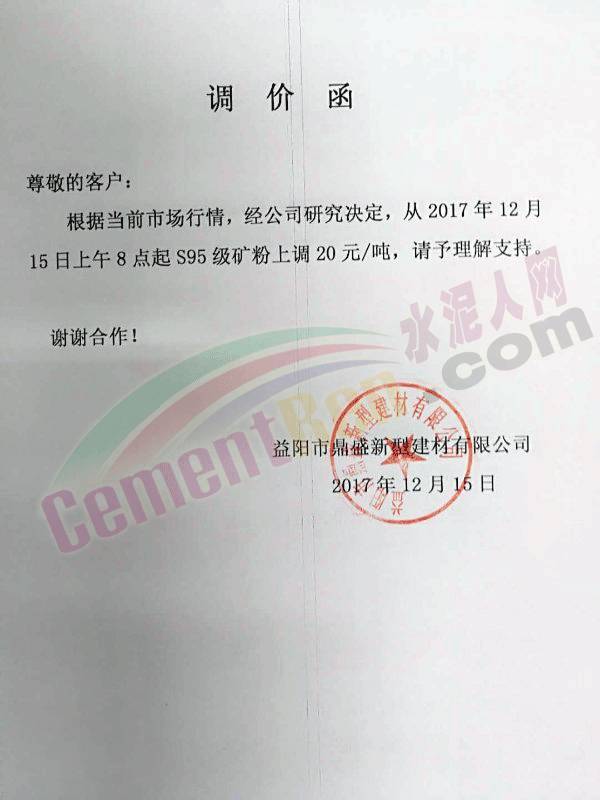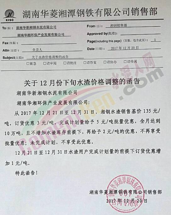 12月20日,湖南華菱湘潭鋼鐵有限公司銷售部向湖南華新湘鋼水泥公司 湖南華湘環(huán)保產(chǎn)業(yè)發(fā)展有限公司發(fā)出關(guān)于12月下旬水渣價(jià)格調(diào)整的通知。