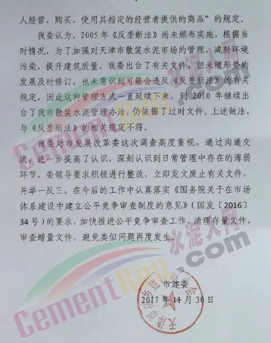 隨后,天津市城鄉(xiāng)建設(shè)委員會發(fā)布《關(guān)于我委散裝水泥管理涉嫌違反<反壟斷法>的情況說明》,明確表示:通過溝通交流,進一步提高了認識,深刻認識到日常管理中存在的薄弱環(huán)節(jié),委領(lǐng)導要求積極進行整改,立即發(fā)文廢止相關(guān)文件。