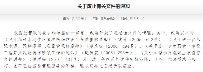 12月中旬,天津市場城鄉(xiāng)建設(shè)委員會發(fā)布《關(guān)于廢止有關(guān)文件的通知》,《關(guān)于加強水泥使用管理確保建設(shè)工程質(zhì)量的通知》(建材〔2005〕642號)、《關(guān)于進一步加強水泥、預拌混凝土質(zhì)量管理的通知》(建質(zhì)安〔2006〕494號)、《關(guān)于進一步加強我市建設(shè)工程禁止現(xiàn)場攪拌砂漿工作的通知》(建質(zhì)安〔2008〕298號)、《關(guān)于加強預拌混凝土質(zhì)量管理的通知》(建質(zhì)安〔2010〕431號)等文件。
