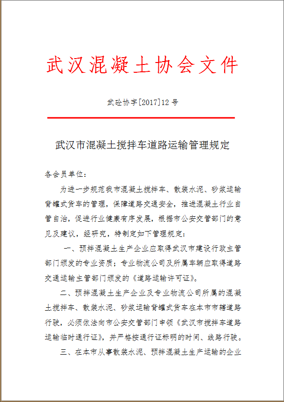 【水泥人網(wǎng)】為進(jìn)一步規(guī)范武漢市混凝土攪拌車、散裝水泥、砂漿運(yùn)輸背罐式貨車的管理,保障道路交通安全,推進(jìn)混凝土行業(yè)自管自治,促進(jìn)行業(yè)健康有序發(fā)展,武漢混凝土協(xié)會(huì)根據(jù)市公安管部門(mén)的意見(jiàn)及建議,經(jīng)研究,特制定《武漢市混凝土攪拌車道路運(yùn)輸管理規(guī)定》,詳情如下: