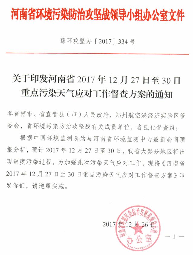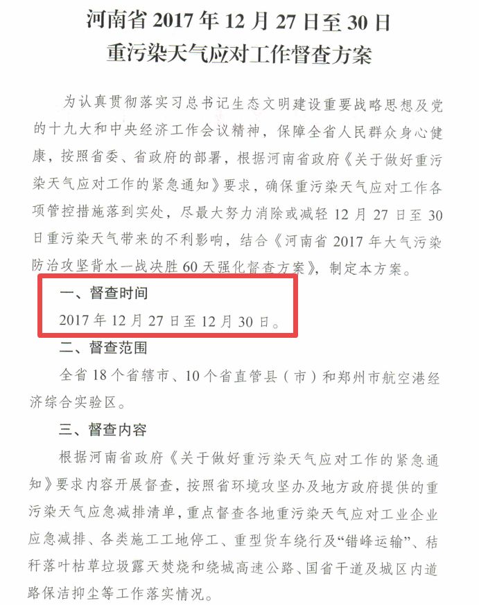 【水泥人網(wǎng)】近日,河南省發(fā)布文件,根據(jù)中國環(huán)境監(jiān)測總站與河南省環(huán)境監(jiān)測中心最新會商預(yù)報分析,預(yù)計2017年12月27日至30日,我省大部分地區(qū)將出現(xiàn)重污染過程,為加強此次污染天氣應(yīng)對工作,將對全省18個省轄市、10個省直管縣(市)和鄭州市航空港經(jīng)濟(jì)綜合試驗區(qū)進(jìn)行為期三天的督查,督查的主要內(nèi)容是檢查涉大氣污染排放工業(yè)企業(yè)停產(chǎn)限產(chǎn)情況,對錯峰生產(chǎn)和重污染天氣應(yīng)急減排清單中的停產(chǎn)企業(yè)是否停到位,對限產(chǎn)企業(yè)的具體限產(chǎn)措施是否落實,對各類工地施工、重型貨車?yán)@行及錯峰運輸?shù)取>唧w督查文件如下: