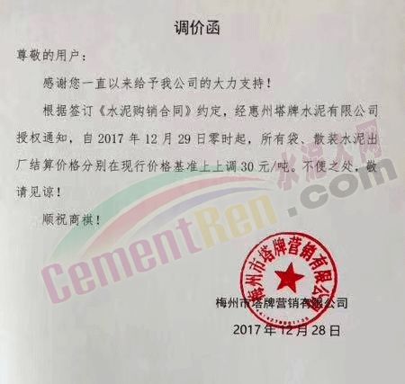 【水泥人網(wǎng)】昨日,梅州市塔牌營銷有限公司發(fā)布提價通知稱:根據(jù)簽訂《水泥購銷合同》約定,經(jīng)惠州塔牌水泥有限公司授權(quán)通知,自今日(29日)零時起,所有袋、散裝水泥出廠結(jié)算價格分別在現(xiàn)行價格基準上上調(diào)30元/噸。
