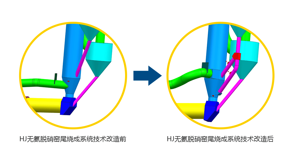匯金無(wú)氨脫硝窯尾燒成系統(tǒng)是由河南匯金智能裝備有限公司研發(fā)團(tuán)隊(duì)研發(fā)的新一代水泥熟料窯尾煅燒技術(shù),以實(shí)際調(diào)研300多條新型干法水泥生產(chǎn)線為根基,采用分解爐高強(qiáng)還原燃燒控制技術(shù),對(duì)回轉(zhuǎn)窯進(jìn)行技術(shù)改造:四級(jí)旋風(fēng)筒下料管對(duì)分解爐下料點(diǎn)位于三次風(fēng)管0.5米之上,將每列單管下料更改為雙管下料;每單列增加一套分料閥、翻板閥、撒料箱及相應(yīng)的下料管延長(zhǎng);三次風(fēng)管的位置上移,在原三次風(fēng)管與窯尾煙室縮口之間形成的強(qiáng)力還原區(qū)的上部。
