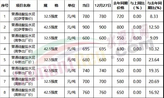 高爭建材、華新水泥、高新雪蓮等水泥生產(chǎn)企業(yè),針對全區(qū)重點項目執(zhí)行政府指導(dǎo)價,分別為普通硅酸鹽32.5(強度)500元、普通硅酸鹽42.5(強度)600元、普通硅酸鹽52.5(強度)800元,與上周持平。