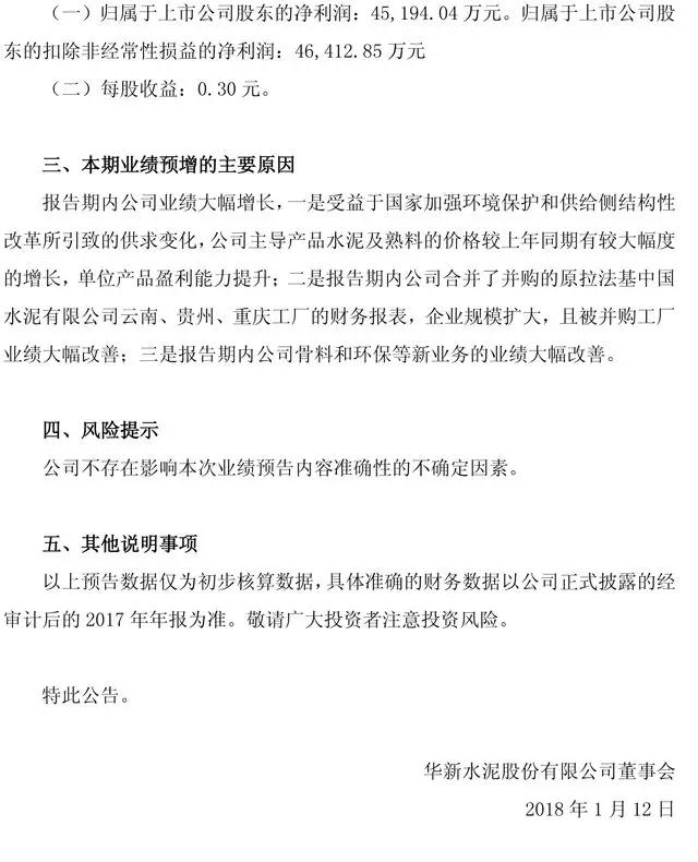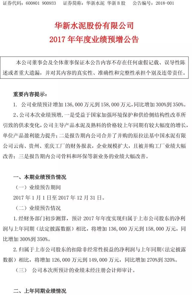 【水泥人網(wǎng)】華新水泥(600801)11日晚發(fā)布業(yè)績(jī)預(yù)告,預(yù)計(jì)2017年凈利同比將增加13.6億元到15.8億元,同比增加300%到350%。