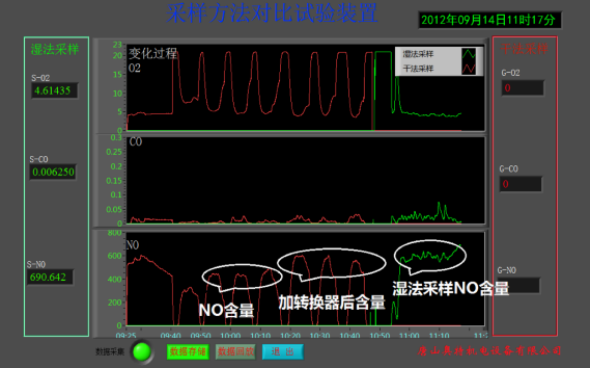 圖中,由于NO數(shù)據(jù)被分析系統(tǒng)消耗掉,比連續(xù)的綠色曲線低約35%。計(jì)算機(jī)就人為地加一個系數(shù)進(jìn)行補(bǔ)償。