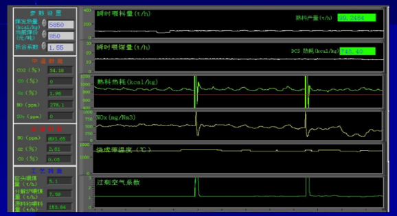 綠色曲線:2017年行標(biāo)推薦的窯尾高溫氣體分析儀采集的連續(xù)的煙氣數(shù)據(jù)曲線,包括上圖中的O2曲線、NO曲線、CO曲線。